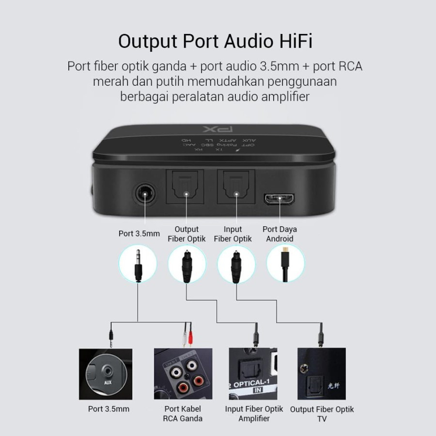 Perangkat ini dilengkapi kabel AUX, kabel RCA, dan kabel SPDIF/TOSLINK/FIBER OPTIK yang memudahkan Anda untuk menghubungkan perangkat sesuai kebutuhan