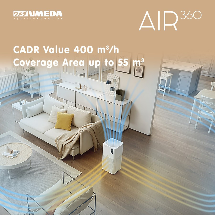 Umeda AIR360 menjadi pilihan #1 untuk smart air purifier karena memiliki all-in-one package. AIR360 memiliki Clean Air Delivery Rate (CADR) yang tinggi yaitu 400 m3/jam yang ideal untuk ruangan besar hingga luas area 55m2. Dengan perlindungan 360⁰ dari semua sisi, input airflow udara lebih besar dan jalur pendistribusian udara bersih mencakup ke seluruh ruangan. AIR360 dilengkapi 3-lapisan filter: H13, Activated Carbon filter dan HEPA PuraWard Filter yang disertifikasi oleh MRI Global USA teruji mampu menyaring VOCs/ sejenis gas berbahaya, menetralkan asap dan bau, mengeliminasi partikel PM 2.5 dan virus setara dengan Sars-Cov-2 hingga 99.46%. AIR360 memiliki fitur reminder untuk masa pergantian Filter. Anda dapat memantau kualitas udara melalui indikator pada layar OLED dengan 3 status warna (Hijau, Oranye, Merah). AIR360 on Auto Mode akan menyesuaikan power dan speed penyaringan bila terdeteksi udara kotor. Kendalikan AIR360 dari smartphone Anda via Tuya Apps untuk menyalakan dan memilih setting timer hingga 12 jam. Ciri khas suara yang lembut dari AIR360 sleep mode menghasilkan “pink noise” yang membantu tidur Anda lebih pulas di malam hari.