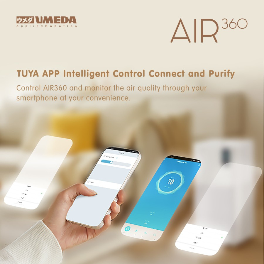 Umeda AIR360 menjadi pilihan #1 untuk smart air purifier karena memiliki all-in-one package. AIR360 memiliki Clean Air Delivery Rate (CADR) yang tinggi yaitu 400 m3/jam yang ideal untuk ruangan besar hingga luas area 55m2. Dengan perlindungan 360⁰ dari semua sisi, input airflow udara lebih besar dan jalur pendistribusian udara bersih mencakup ke seluruh ruangan. AIR360 dilengkapi 3-lapisan filter: H13, Activated Carbon filter dan HEPA PuraWard Filter yang disertifikasi oleh MRI Global USA teruji mampu menyaring VOCs/ sejenis gas berbahaya, menetralkan asap dan bau, mengeliminasi partikel PM 2.5 dan virus setara dengan Sars-Cov-2 hingga 99.46%. AIR360 memiliki fitur reminder untuk masa pergantian Filter. Anda dapat memantau kualitas udara melalui indikator pada layar OLED dengan 3 status warna (Hijau, Oranye, Merah). AIR360 on Auto Mode akan menyesuaikan power dan speed penyaringan bila terdeteksi udara kotor. Kendalikan AIR360 dari smartphone Anda via Tuya Apps untuk menyalakan dan memilih setting timer hingga 12 jam. Ciri khas suara yang lembut dari AIR360 sleep mode menghasilkan “pink noise” yang membantu tidur Anda lebih pulas di malam hari.